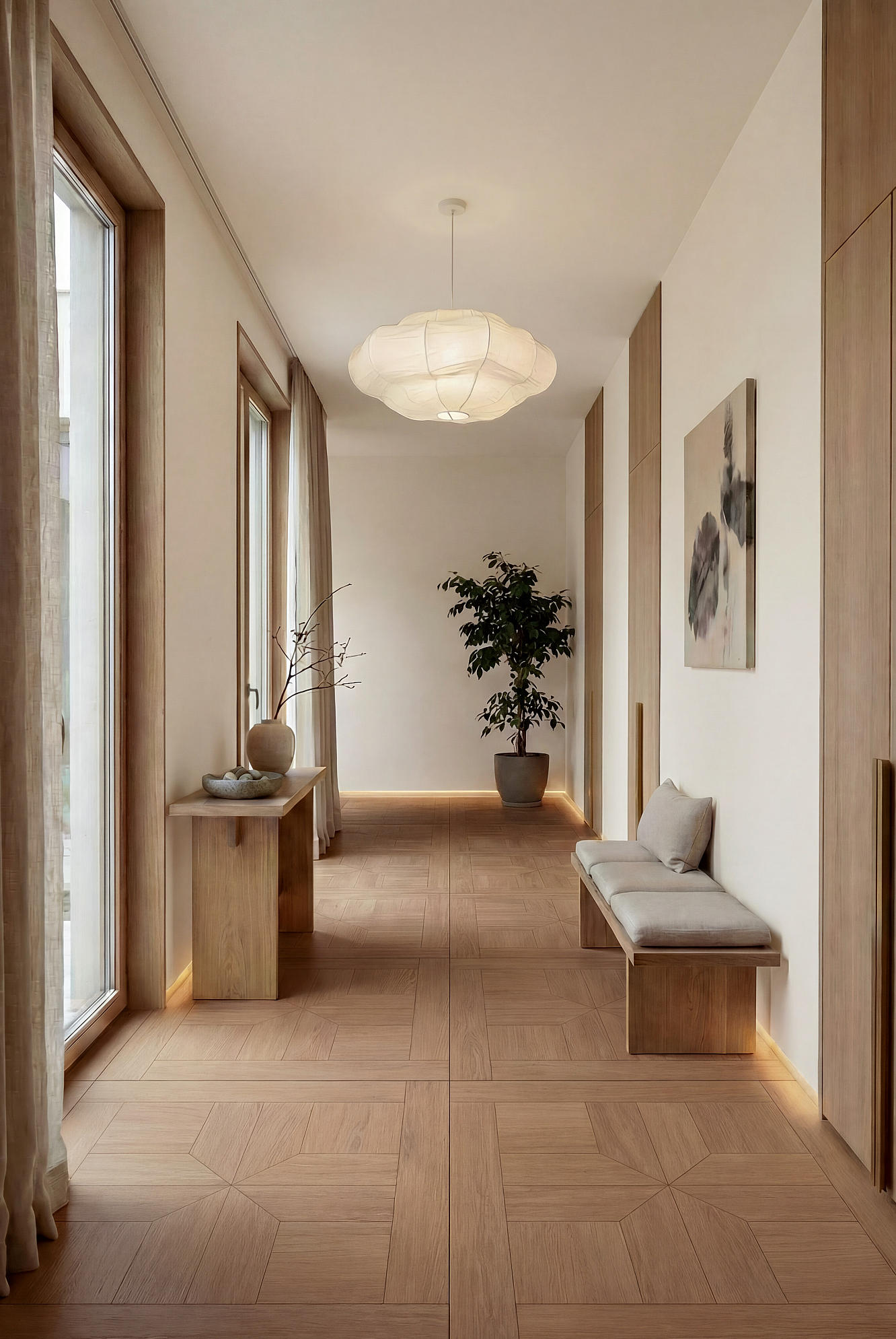 淺夏格調(diào)以萬字拼花為設(shè)計(jì)錨點(diǎn),將幾何的秩序韻律,織入原生木色的溫柔肌理,打造讓空間有情緒、有質(zhì)感的生活載體,讓每一道木紋都承載著歲月沉甸甸鄂故事。